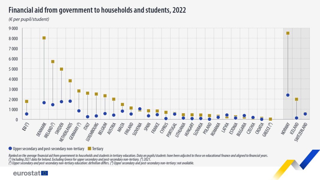Σύμφωνα με τα πιο πρόσφατα στοιχεία της Eurostat, η Ελλάδα βρίσκεται στην τελευταία θέση μεταξύ των χωρών της ΕΕ όσον αφορά τις οικονομικές ενισχύσεις προς φοιτητές ανώτατης εκπαίδευσης το 2022.
