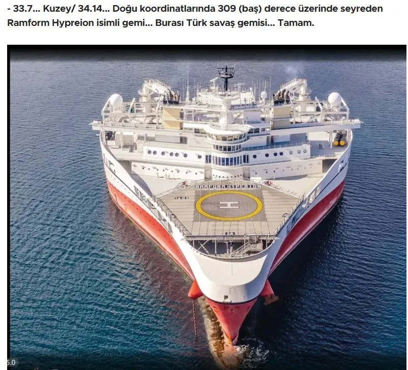Το πλοίο με το όνομα Ramform Hypreion, πλέει στις 33,7… Βόρεια / 34,14… Ανατολικές συντεταγμένες στις 309 μοίρες (κεφαλή)… Εδώ είναι τουρκικό πολεμικό πλοίο… οκ.