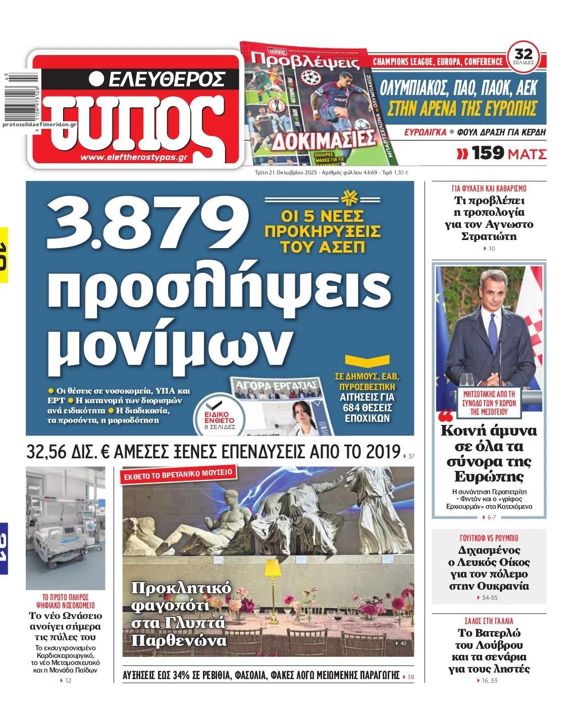 Δείτε εδώ τα πρωτοσέλιδα των εφημερίδων σήμερα Τρίτη 21 Οκτωβρίου 2025. Συνεχίστε την ανάγνωση.