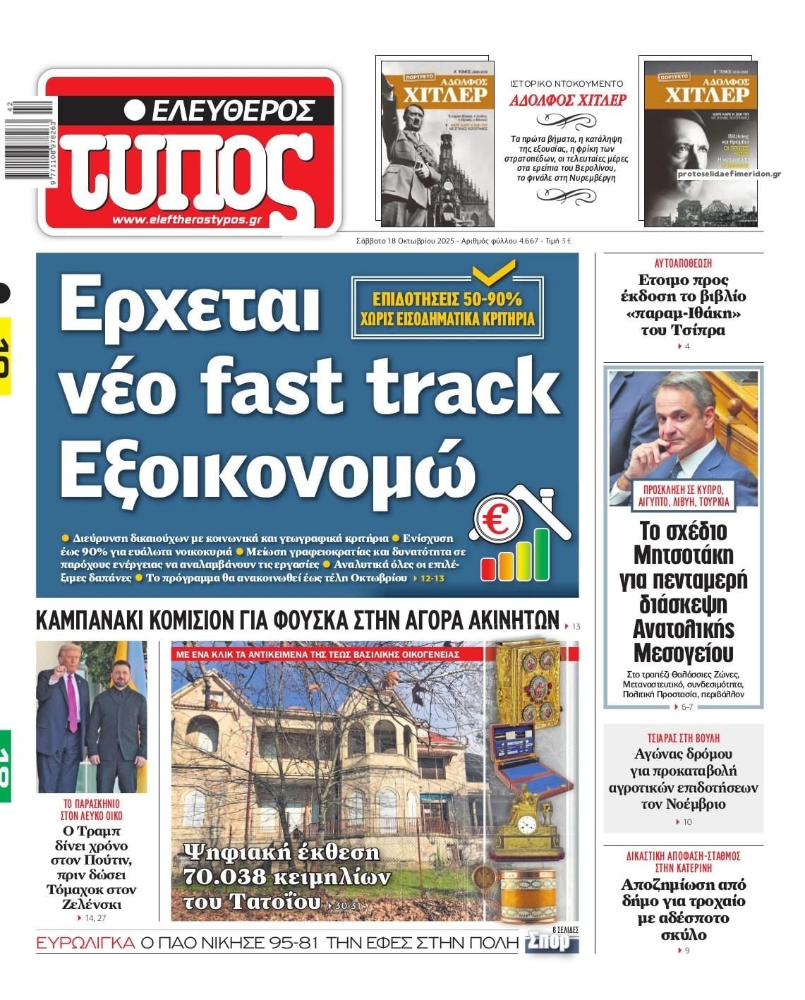 Δείτε εδώ τα πρωτοσέλιδα των εφημερίδων σήμερα Σάββατο 18 Οκτωβρίου 2025. Συνεχίστε την ανάγνωση.