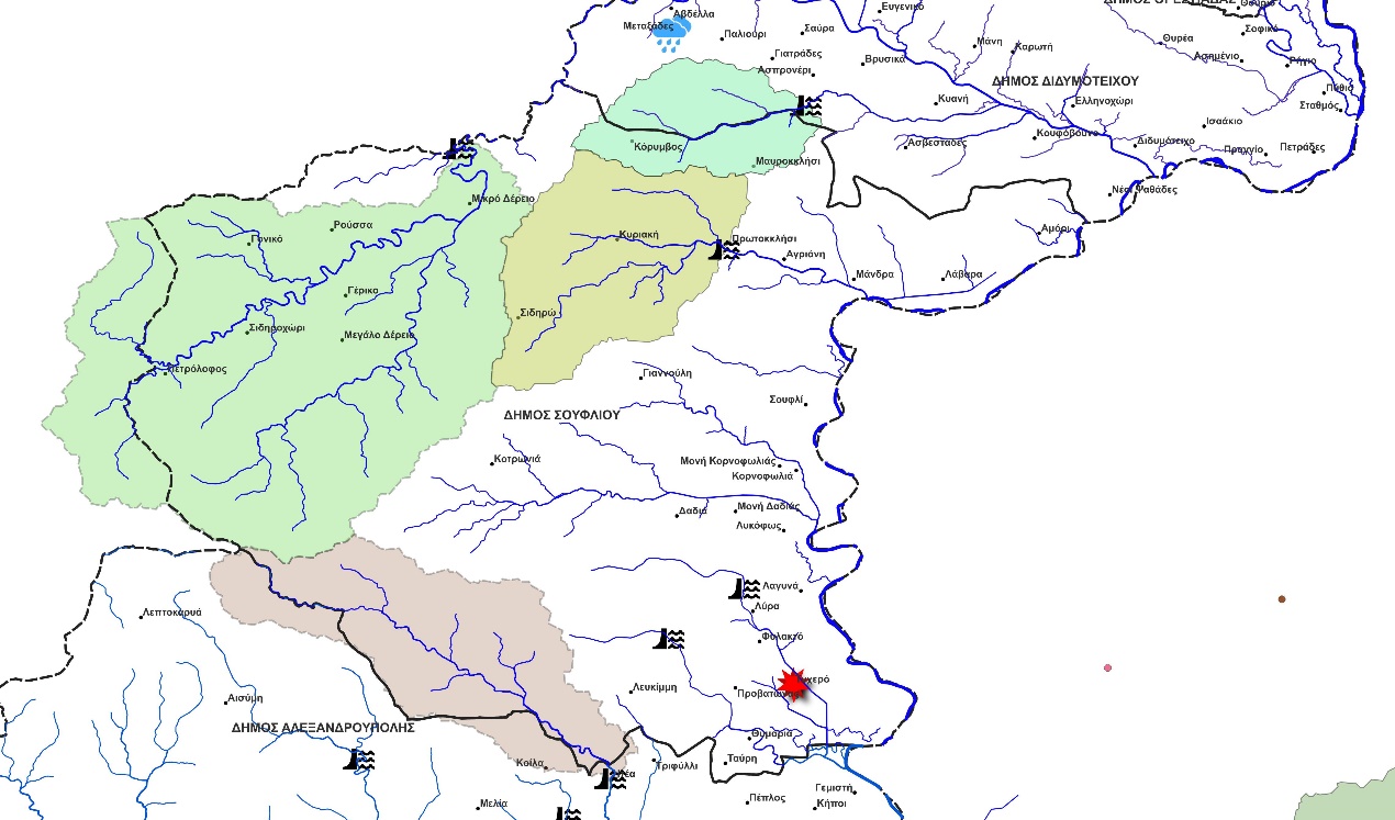 Εικόνα 1. Η απεικόνιση, των «λεκανών απορροής» (χρωματισμένες με διαφορετικές αποχρώσεις) (των ρεμάτων που αντιστοιχούν έως τις θέσειςστις οποίες είτε κατασκευάστηκαν είτε πρόκειται να κατασκευαστούν είτε προτείνονται να κατασκευαστούν από τον συγγραφέα του παρόντος άρθρου, τα τέσσερα διαφορετικά φράγματα), των «υδρογραφικών(γραμμικών) δικτύων» (γραμμές με «έντονη μπλε» απόχρωση), τωνθέσεων των τεσσάρων διαφορετικών φραγμάτων (σύμβολο «φράγμα με νερό εκατέρωθεν των πλευρών του» με «μαύρη» απόχρωση), των «Μεταξάδων, Δήμου Διδυμοτείχου, Π.Ε. Έβρου», (σύμβολο «σύννεφομε βροχή» με «γαλάζια» απόχρωση, τα όρια των διάφορων «Δήμων» της «Π.Ε. Έβρου» (συνεχείς και διακεκομμένες γραμμές με «μαύρη» απόχρωση), οι οικισμοί της «Π.Ε. Έβρου» (κουκίδες με «μαύρη» απόχρωση), όπως απεικονίζονται στο «ελεύθερο διαδικτυακά λογισμικό» «Q.G.I.S.» [4], μέσω των σχετικών αρχείων που ανακτήθηκαν τόσο από την σχετική διαδικτυακή «πλατφόρμα» («Copernicus») όσο και από την σχετική διαδικτυακή «πλατφόρμα» («ΕΛ.ΣΤΑΤ.»), [1,2,4].