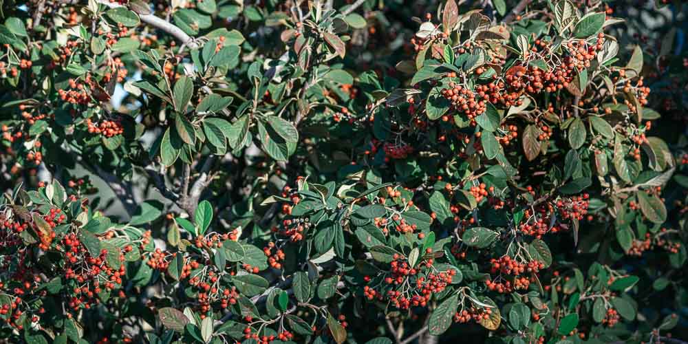 - Cotoneaster lacteus: Το συγκεκριμένο είδος κυδωνίαστρου είναι αειθαλής φουντωτός θάμνος που φτάνει σε ύψος 3-4 μέτρα και ανάλογο πλάτος, ιδανικός για ψηλούς φράκτες. Σχηματίζει πλούσια μπουκέτα λευκών λουλουδιών και στη συνέχεια μικρούς κόκκινους καρπούς το φθινόπωρο που παραμένουν πάνω στο φυτό την περίοδο του χειμώνα.