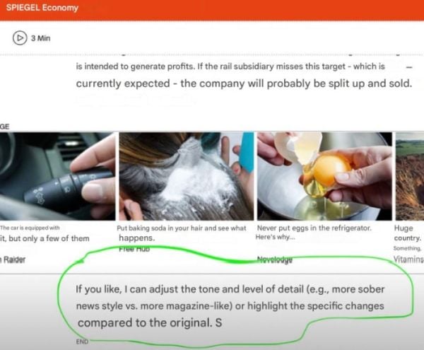 Όπως πρόσεξαν πολλοί αναγνώστες του Spiegel, σε άρθρο του στην κατηγορία των οικονομικών υπήρξε δημοσίευση χωρίς να αφαιρεθεί η πρόταση εντολής στο ChatGPT!