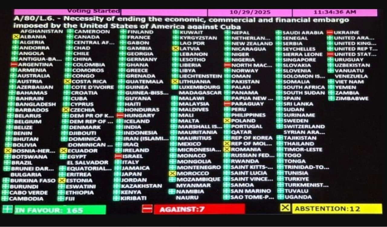 Η Κούβα εκτίμησε ότι το αποτέλεσμα της ψηφοφορίας αντιπροσωπεύει ένα «σαφές και ηχηρό μήνυμα» προς την Ουάσινγκτον ότι ο κόσμος απαιτεί τον τερματισμό του αποκλεισμού και την υποστήριξη του δικαιώματος των Κουβανών στην οικονομική και κοινωνική ανάπτυξη.