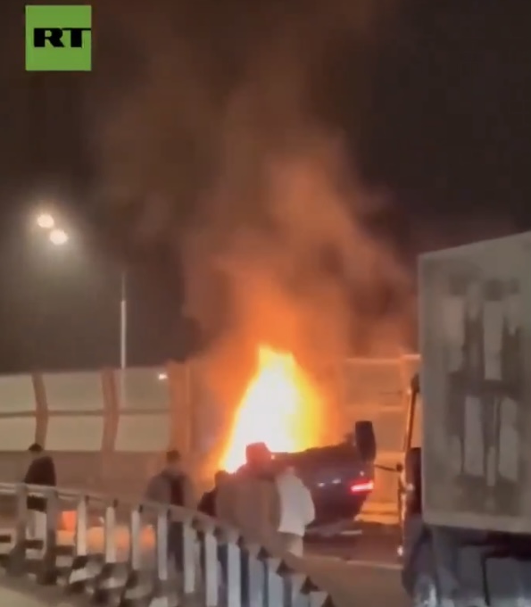 Πλάνα από το σημείο δείχνουν το SUV αναποδογυρισμένο και φλεγόμενο, ενώ χαρτονομίσματα ρουβλίων σκορπισμένα στο οδόστρωμα προσδίδουν ακόμα μεγαλύτερη δραματικότητα στην εικόνα του δυστυχήματος.