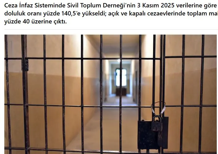 Τα ενημερωμένα στοιχεία που δημοσίευσε η Ένωση της Κοινωνίας των Πολιτών στο Ποινικό Σύστημα (CİSST) στις 3 Νοεμβρίου 2025 αποκαλύπτουν ότι ο υπερπληθυσμός των φυλακών στην Τουρκία έχει φτάσει σε κρίσιμο επίπεδο. Σύμφωνα με την ένωση, η πληρότητα των φυλακών έχει αυξηθεί στο 140,50%, που σημαίνει ότι οι φυλακές υπερβαίνουν τη χωρητικότητά τους κατά 40,5%.