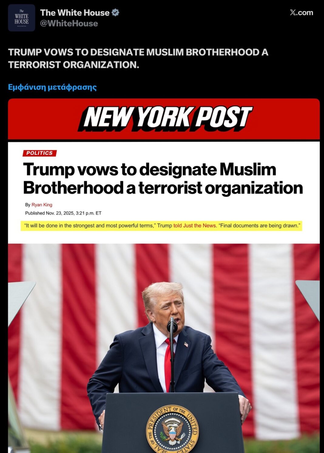 Ο Πρόεδρος Ντόναλντ Τζ. Τραμπ υπέγραψε σήμερα Εκτελεστική Διαταγή που ξεκινά άμεσα τη διαδικασία για την επίσημη κατάταξη κεφαλαίων της Μουσουλμανικής Αδελφότητας ως Ξένων Τρομοκρατικών Οργανώσεων (FTO) και Ειδικά Οριζόμενων Παγκόσμιων Τρομοκρατών (SDGT). Η κίνηση αυτή θεωρείται μία από τις πιο σημαντικές αντιτρομοκρατικές αποφάσεις της νέας θητείας του.