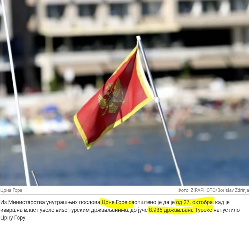 Το Υπουργείο Εσωτερικών του Μαυροβουνίου ανακοίνωσε ότι από τις 27 Οκτωβρίου, όταν η εκτελεστική εξουσία εισήγαγε βίζες για τους Τούρκους πολίτες, 8.935 Τούρκοι πολίτες έχουν εγκαταλείψει το Μαυροβούνιο μέχρι χθες.