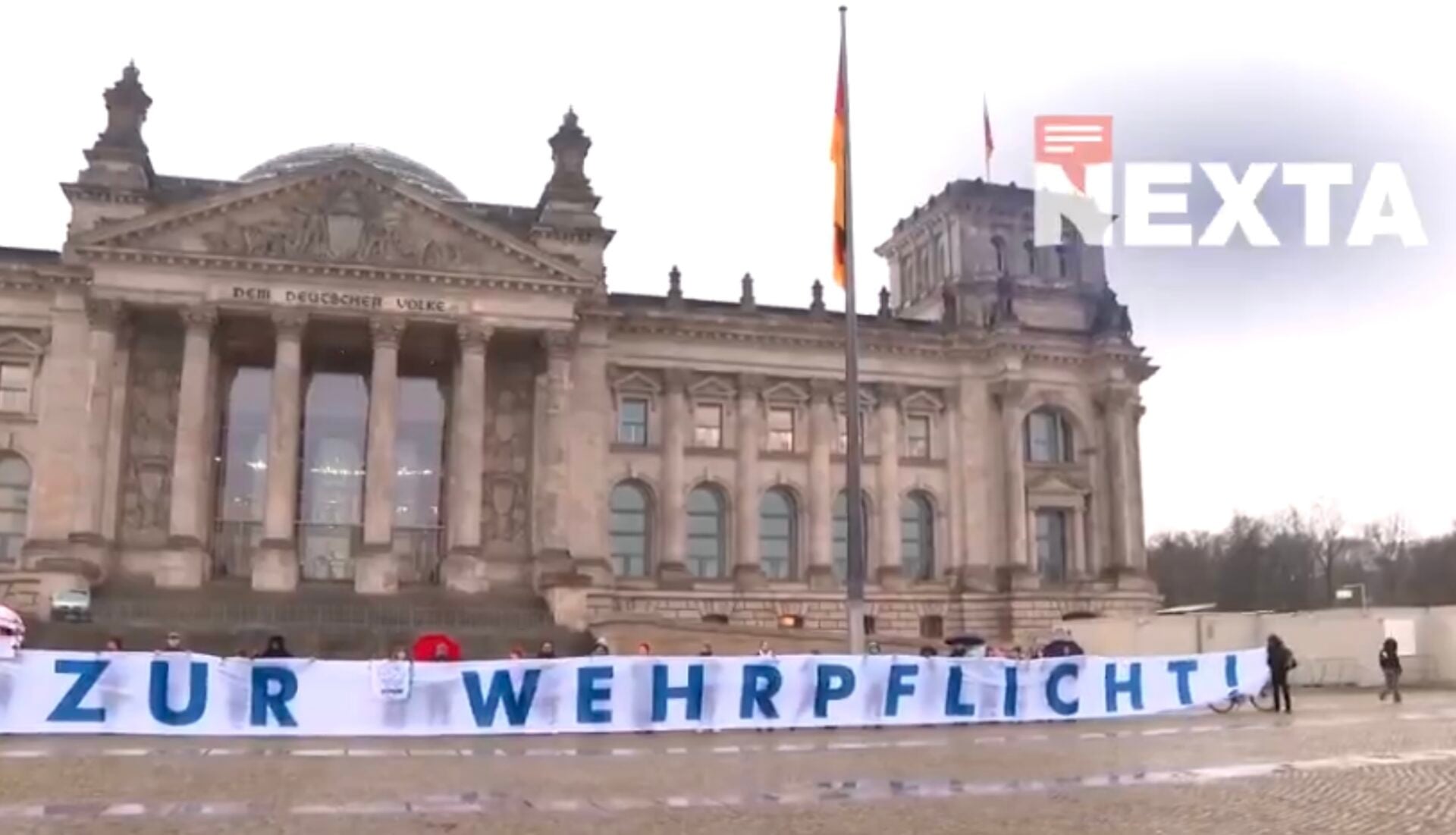 Έξω από το κτίριο του κοινοβουλίου στο Βερολίνο, νέοι συγκεντρώθηκαν κρατώντας μια πινακίδα που έγραφε «Καμία στράτευση». Οι ακτιβιστές υποστηρίζουν ότι ο νέος νόμος περί στράτευσης θα υπονομεύσει τις προσωπικές ελευθερίες.