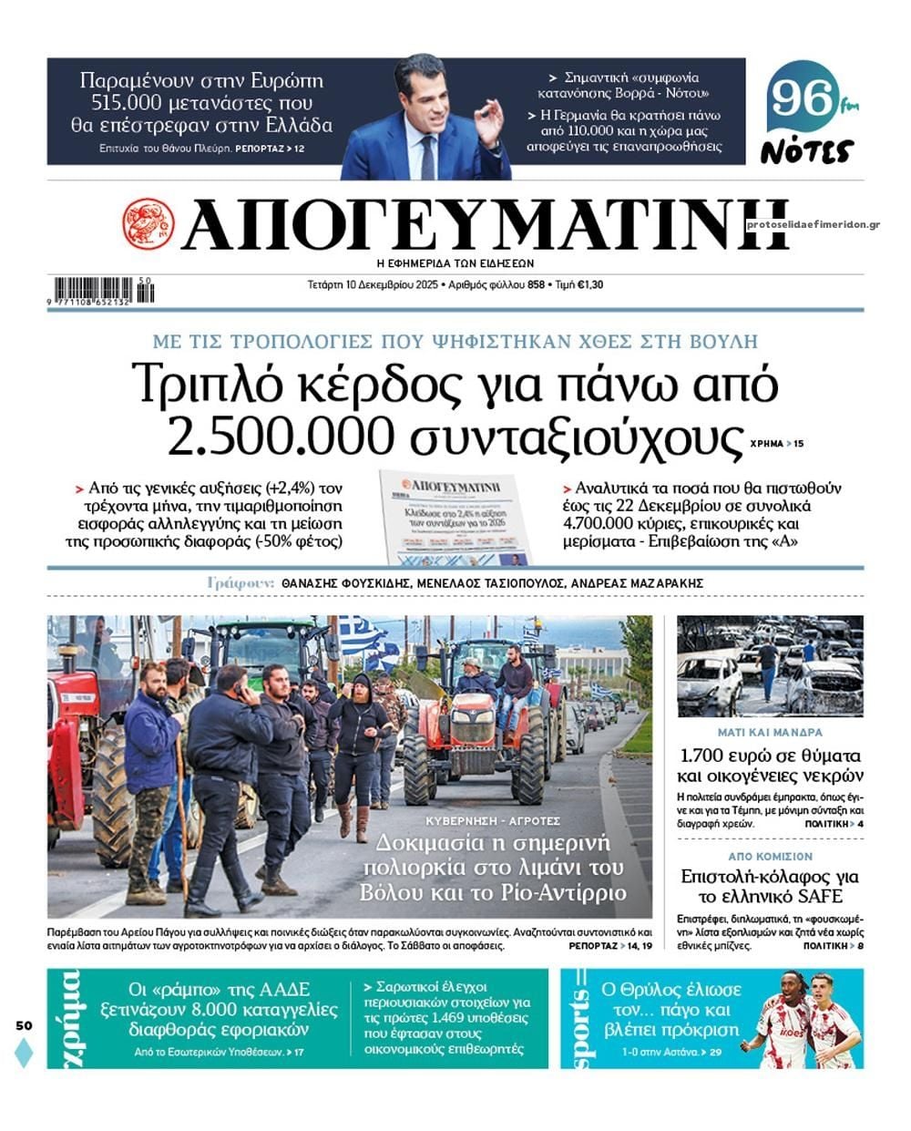 Δείτε εδώ τα πρωτοσέλιδα των εφημερίδων σήμερα Τετάρτη 10 Δεκεμβρίου 2025. Συνεχίστε την ανάγνωση.