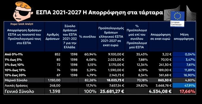 Μια ματιά στην ευρωπαϊκή αναλυτική λίστα της απορροφητικότητας των προγραμμάτων και δράσεων του ελληνικού ΕΣΠΑ, δείχνει τα εξής συγκλονιστικά.