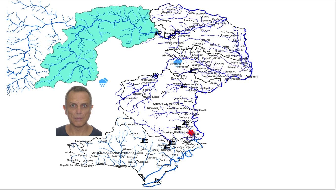 IMG 1387 1Εικόνα 1.2. ​Η απεικόνιση, της «λεκάνης απορροής» (χρωματισμένη με «ανοιχτή πράσινη» απόχρωση) του φράγματος «Ivaylovgrad», των ρεμάτων που αντιστοιχούν έως την θέση στην οποία κατασκευάστηκε το φράγμα «Ivaylovgrad», του «υδρογραφικού (γραμμικού) δικτύου» (γραμμές με «έντονη μπλε» απόχρωση) έως την θέση που κατασκευάστηκε το συγκεκριμένο φράγμα, της θέσης του Bουλγάρικουφράγματος «Ivaylovgrad» (πολύ κοντά στην βορειοδυτική πλευρά της «Π.Ε. Έβρου») καθώς επίσης και των Ελληνικών φραγμάτων της «Π.Ε. Έβρου» (σύμβολο «φράγμα με νερό εκατέρωθεν των πλευρών του» με «μαύρη» απόχρωση), των μετεωρολογικών σταθμών της «Βυρσίνης, Δήμου Αρριανών, Π.Ε. Ροδόπης» και των «Μεταξάδων, Δήμου Διδυμοτείχου, Π.Ε. Έβρου», (σύμβολο «σύννεφο με βροχή» με «γαλάζια» απόχρωση, τα όρια των διάφορων «Δήμων» της «Π.Ε. Έβρου» (συνεχείς και διακεκομμένες γραμμές με «μαύρη» απόχρωση),οι οικισμοί της «Π.Ε. Έβρου» (κουκίδες με «μαύρη» απόχρωση), το «υδρογραφικό (γραμμικό) δίκτυο» (γραμμές με «έντονη μπλε» απόχρωση) της «Π.Ε. (Νομού) Έβρου» «Π.Ε. Έβρου» (κουκίδες με «μαύρη» απόχρωση) και η θέση του οικισμού «Τυχερό, Δήμου Σουφλίου, Π.Ε. Έβρου» (σύμβολο «αστέρι» με «κόκκινη» απόχρωση), όπως απεικονίζονται στο «ελεύθερο διαδικτυακά λογισμικό» «Q.G.I.S.» [4], μέσω των σχετικών αρχείων που ανακτήθηκαν τόσο από την σχετική διαδικτυακή «πλατφόρμα» («Copernicus») όσο και από την σχετική διαδικτυακή «πλατφόρμα» («ΕΛ.ΣΤΑΤ.»), [1,2,4].