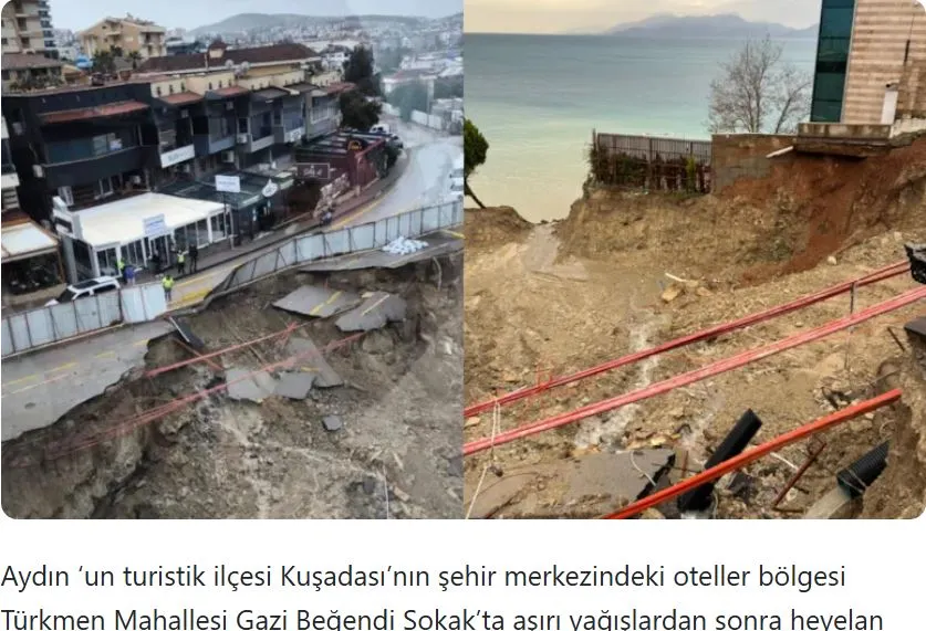 Όπως σημειώνουν τα τουρκικά ΜΜΕ, μεγάλης έκτασης κατολίσθηση σημειώθηκε στην οδό Γκαζί Μπεγέντι, στη γειτονιά Τουρκμέν, στην περιοχή των ξενοδοχείων του Κουσάντασι, μιας τουριστικής πόλης στο Αϊδίνι, μετά από έντονες βροχοπτώσεις.