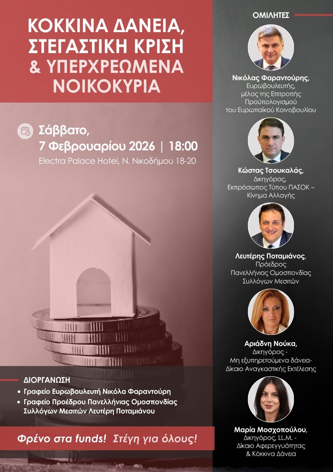 Σας περιμένουμε το ερχόμενο Σάββατο 7 Φεβρουαρίου στις 18:00 στο ξενοδοχείο Electra στην Αθήνα για να συζητήσουμε για την προστασία της στέγης απέναντι στη σύγχρονη κοινωνική μάστιγα της ασυδοσίας των funds και των εισπρακτικών στη χώρα μας.
