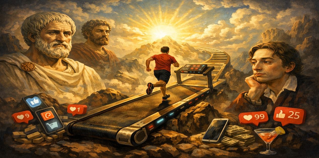 Από τον Διαφωτισμό έως τη ρομαντική αντίδραση, η αναζήτηση της ευτυχίας μοιάζει συχνά με έναν ηδονικό διάδρομο: όσο πιο γρήγορα τρέχουμε, τόσο λιγότερο φτάνουμε. Όσο κι αν αυξάνουμε τις απολαύσεις μας, τελικά επιστρέφουμε στο ίδιο επίπεδο ικανοποίησης.
