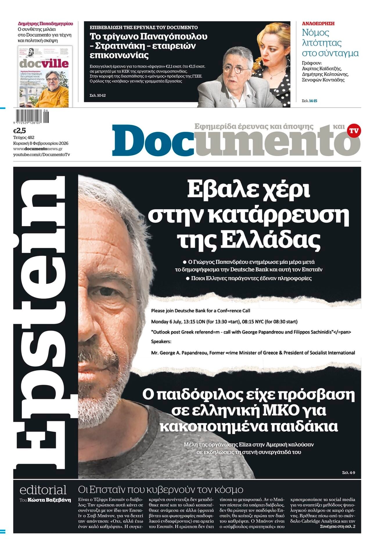 Ήταν πλήρως ενημερωμένος για την Ελληνική κρίση μέσα από ένα δίκτυο που του έδινε πληροφορίες. Το τραγικό είναι ότι στις 6 Ιουλίου 2015, μια μέρα μετά το δημοψήφισμα, ο πρώην πρωθυπουργός Γιώργος Παπανδρέου , ενημερώνει την Deutsche Bank για τις εξελίξεις και την πολιτικοοικονομική κατάσταση (σαν να ήταν υπάλληλός της!) και αυτή ενημερώνει τον Έπσταϊν. Ο παιδόφιλος φαίνεται ότι τζόγαρε με την ελληνική Οικονομία