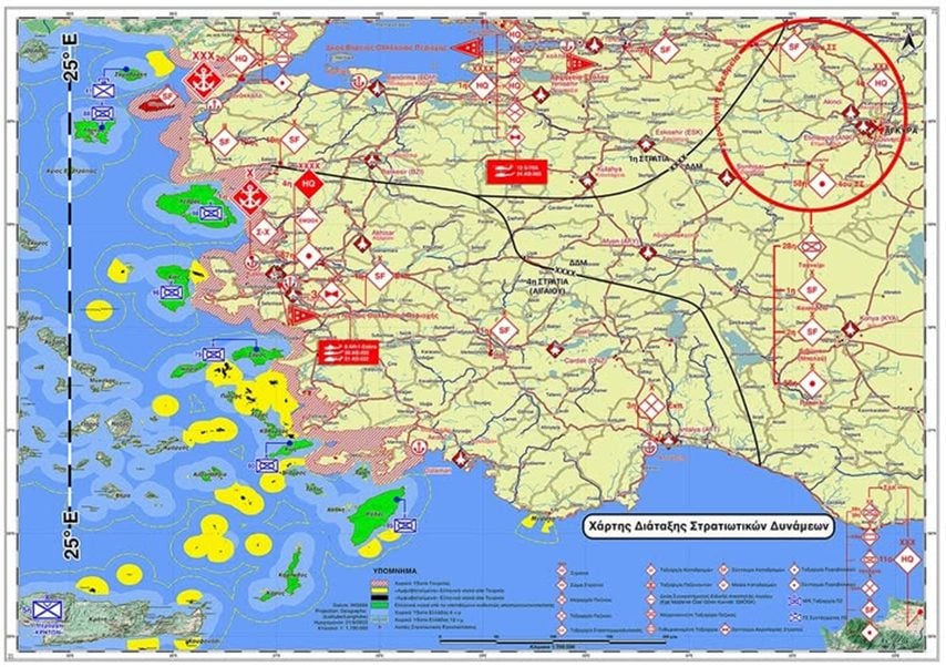 Ο ανωτέρω χάρτης όμως μιλά από μόνος του και καταδεικνύει: 1) Τον τουρκικό στόχο για διχοτόμηση του Αιγαίου στον 25ο Μεσημβρινό, 2) την αμφισβήτηση της κυριαρχίας των ελληνικών νησιών, 3) την παρουσία των τουρκικών ενόπλων δυνάμεων και την ισχύ τους εάν η Ελλάδα δεχτεί την τουρκική αξίωση περί αποστρατιωτικοποίησης των νησιών του Αιγαίου, που θα δημιουργήσει συνθήκες ανάλογες, αν όχι χειρότερες με αυτές της αποχώρησης της Ελληνικής Μεραρχίας από την Κύπρο το 1967.