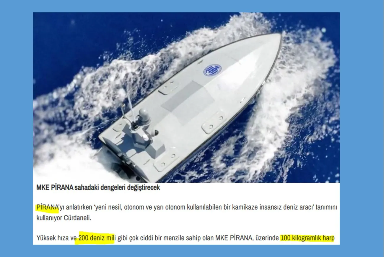 Ο Κιουρντανέλι περιγράφει το PİRANA ως «ένα αυτόνομο και ημιαυτόνομο μη επανδρωμένο θαλάσσιο όχημα καμικάζι νέας γενιάς».