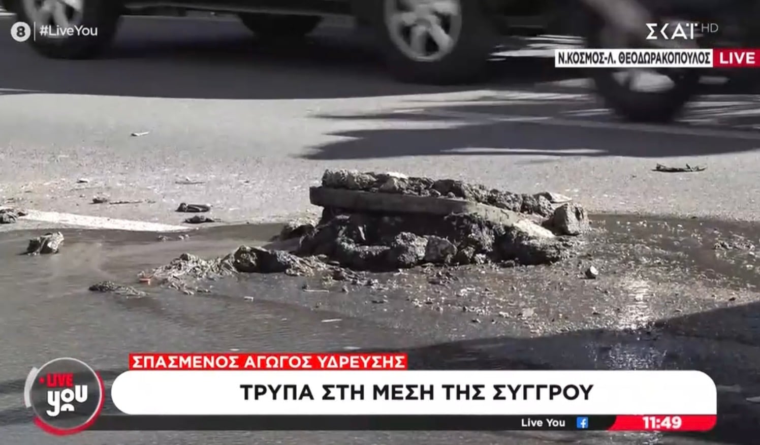 Το πρόβλημα φαίνεται πως οφείλεται σε βλάβη σε αγωγό νερού, καθώς από την τρύπα αναβλύζει νερό με μεγάλη πίεση, δημιουργώντας επικίνδυνες συνθήκες για τη διέλευση των οχημάτων.