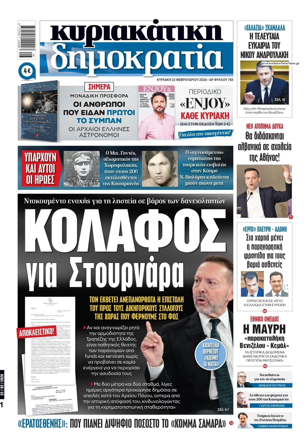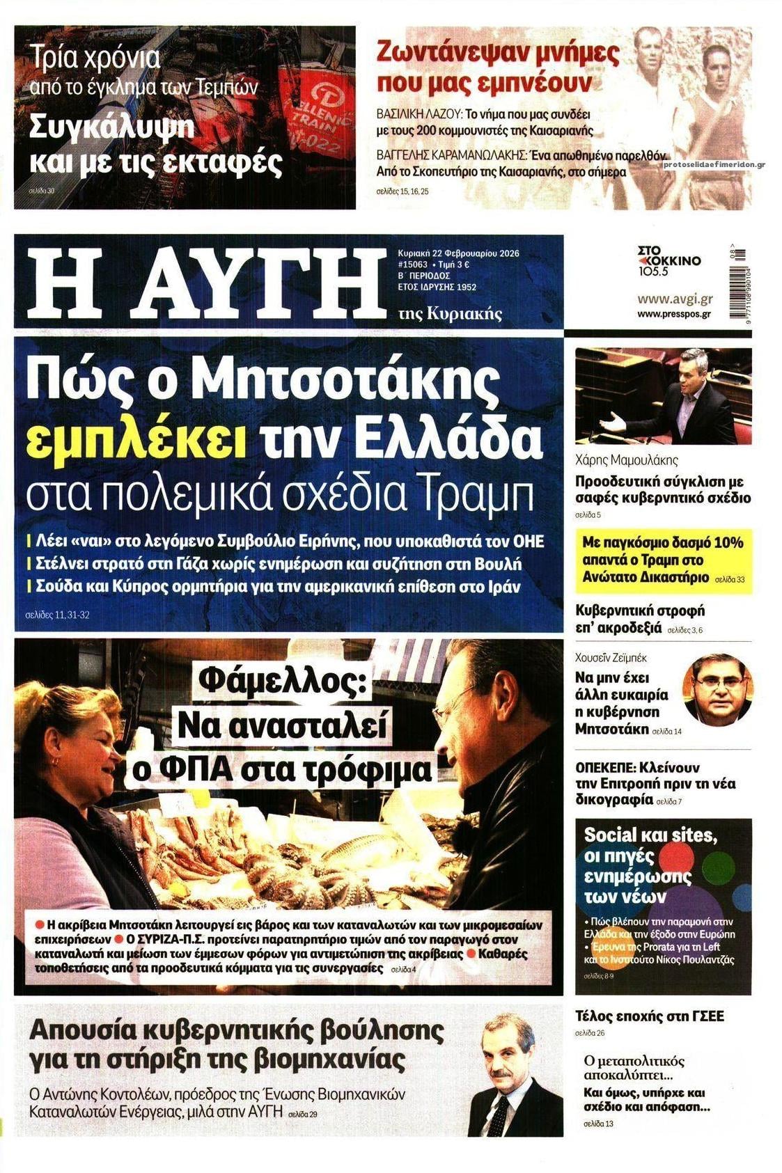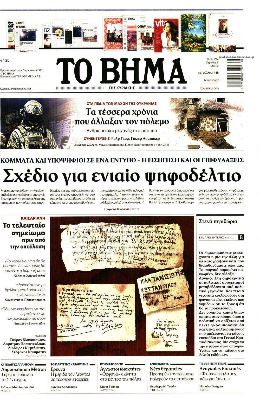 Δείτε εδώ τα πρωτοσέλιδα των εφημερίδων σήμερα Κυριακη 15 Φεβρουαρίου 2026. Συνεχίστε την ανάγνωση.