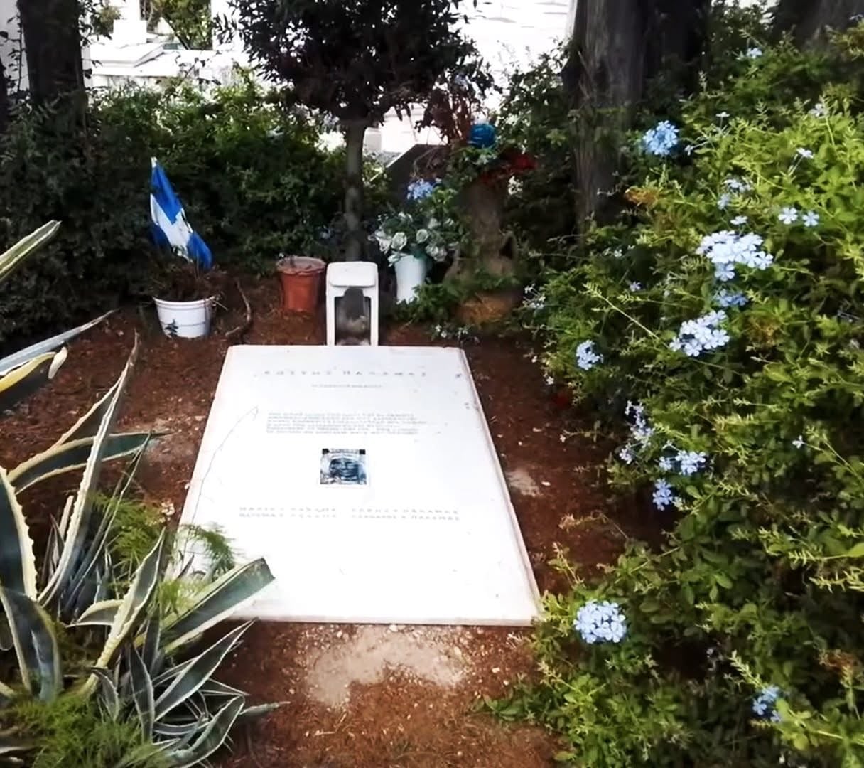 Μνήμα λιτό, με μια μαρμάρινη πλάκα πάνω στο χώμα. Το καντήλι για το αιώνιο φως, η ελληνική σημαιούλα και ο μικρός ολάνθιστος κήπος.