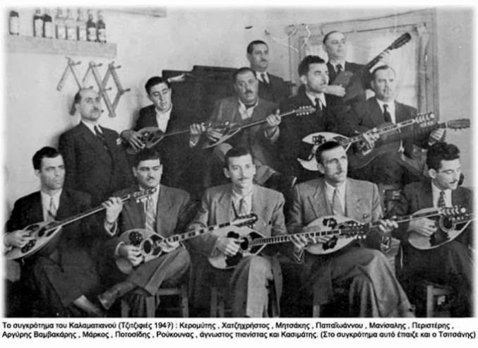 Δεσπόζουν ο Στράτος Παγιουμτζής και ο Μάρκος Βαμβακάρης, που βρίσκεται στο απόγειο της καλλιτεχνικής του σταδιοδρομίας. Γράφει χαρακτηριστικά ο Καραγάτσης «Είμαστε όλοι πλακαδόροι της καλλιτεχνίας του δίσκου, μου δηλώνει ο Στράτος. Κάτσε να ακούσεις την πενιά/πιές ένα ποτηράκι/ αν θες να πιείς και ναργιλέ/ περίμενε λιγάκι/». «Είναι οι νεαροί με το γαρύφαλλο στ΄ αυτί», καταγράφει ο Καραγάτσης, «που σε κοιτούν με μάτια θολά σαν να ήσουν τέρας της οδού Αθηνάς. Είναι τα παιδιά τα λίαν μυστήρια, «εργασίας του ποδός», είναι τα κορίτσια των πέριξ συνοικιών, που προαλείφονται για το μέλλον. Είναι οι ψαράδες της παραλίας που το ρίχνουν έξω, με τον δικό τους τρόπο, είναι και τα τέως «παιδιά» που η τύχη τους γέμισε το πορτοφόλι και τώρα γλεντούν πολύ βλοσυρά και αξιόπρεπα, κρατώντας την παρακαθήμενη γκόμενα σε αυστηρή πειθαρχία».