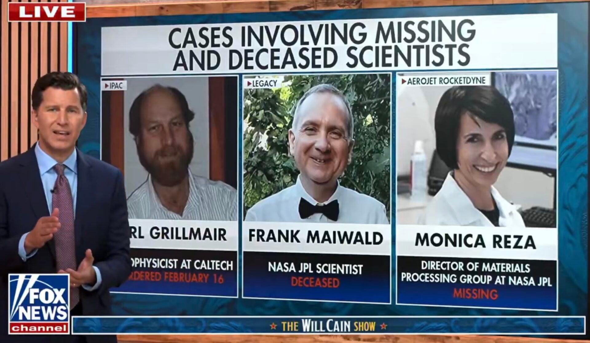 Ο Γουίλ Κέιν του Fox News αποκαλύπτει ότι αρκετοί υψηλού προφίλ επιστήμονες και άκρως απόρρητοι στρατιωτικοί αξιωματούχοι έχουν πρόσφατα εξαφανιστεί ή βρεθεί νεκροί