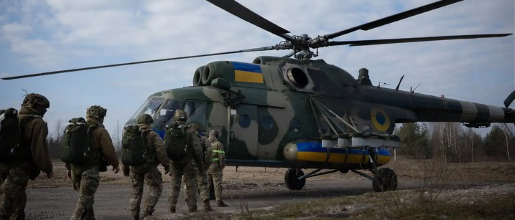 Στρατιώτες των Αεροπορικών Δυνάμεων Εφόδου των Ενόπλων Δυνάμεων της Ουκρανίας παρακολουθούν μια προσγείωση ελικοπτέρου. Suspilne News/Oleksandr Mahula