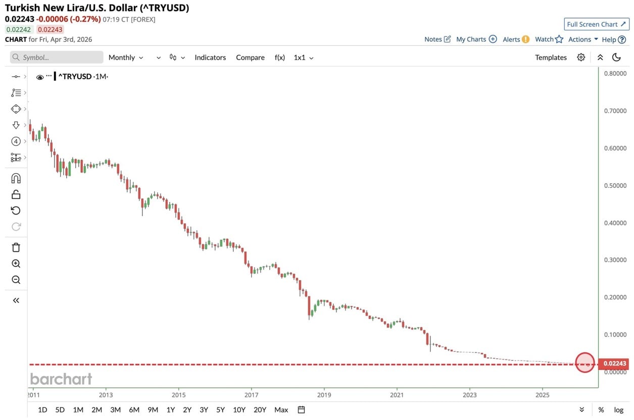 Η απόλυτη κατάρρευση της Τουρκικής λίρας, παρά το γεγονός ότι ο Ερντογάν έχει πουλήσει δεκάδες τόνους χρυσού που διατηρούσε στα αποθέματα, για να στηρίξει το νόμισμα…