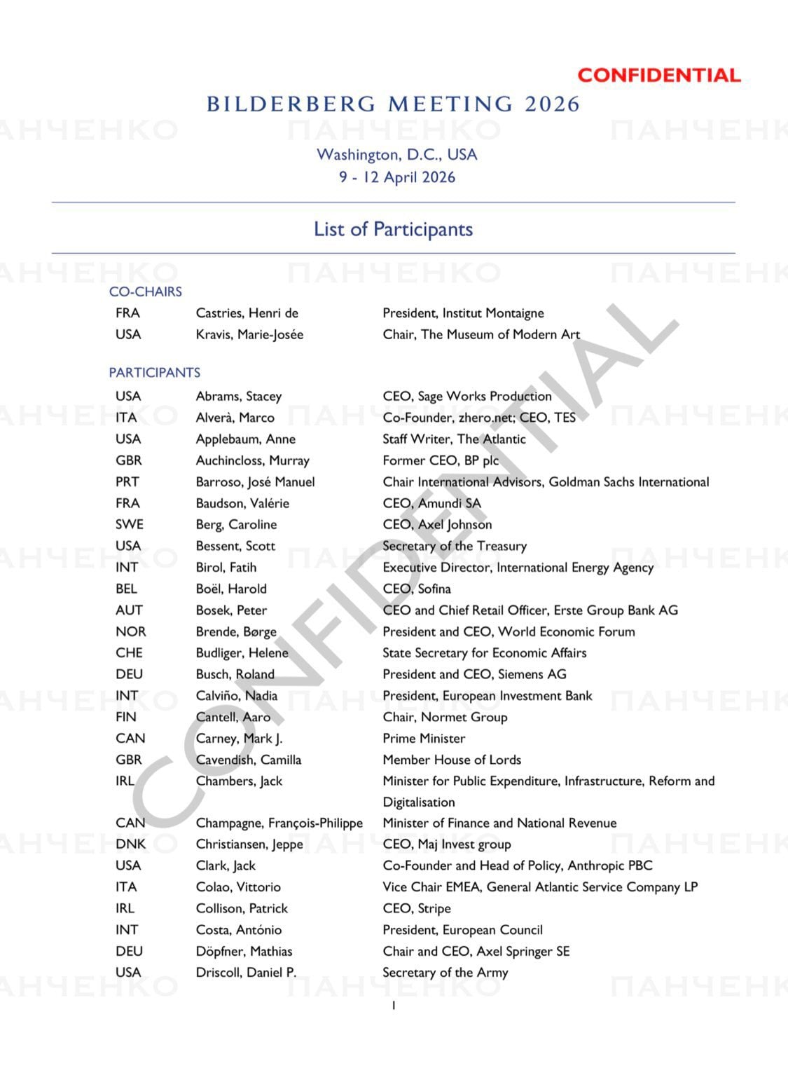 Η λίστα συμμετεχόντων στη συνεδρίαση της λέσχης Μπίλντεμπεργκ για το 2026