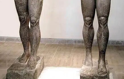 Δύο αρχαϊκά αγάλματα γυμνών νέων ανδρών (Κούροι), λαξευμένα σε γκρίζο λίθο, όρθια και σε μετωπική στάση. Έχουν τυποποιημένα χαρακτηριστικά, μακριά πλεγμένα μαλλιά και το αριστερό τους πόδι είναι τοποθετημένο ελαφρώς μπροστά από το δεξί, υποδηλώνοντας ένα στατικό βήμα. Το φόντο είναι ένας απλός τοίχος μουσείου.