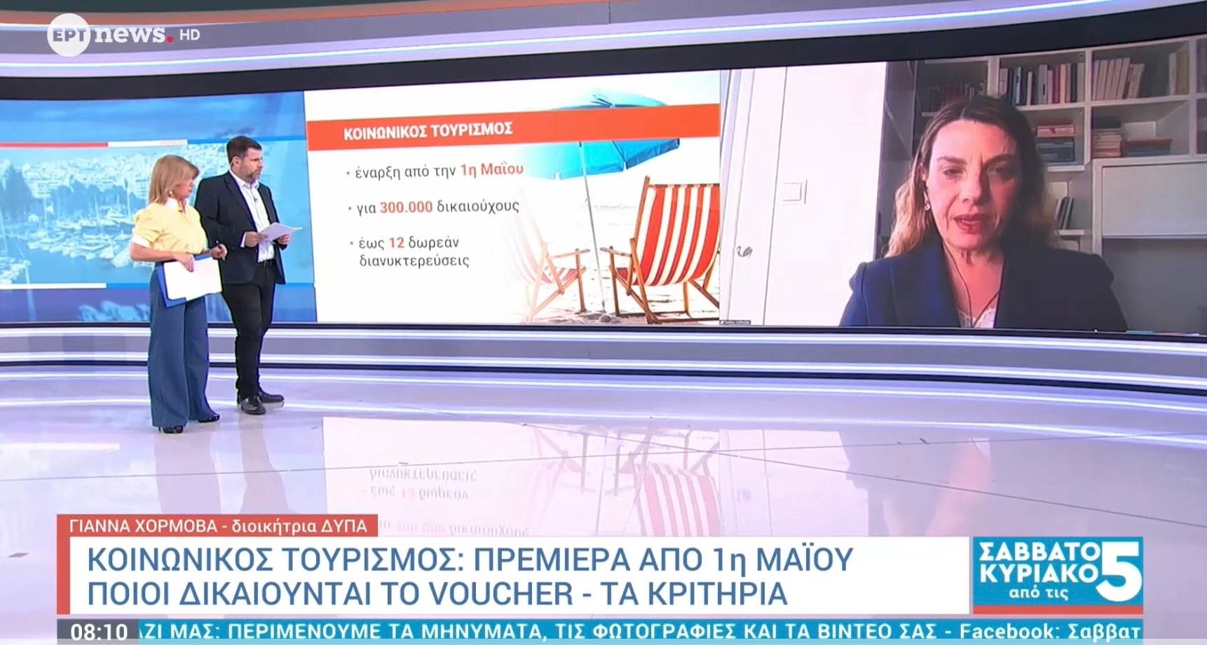 Από την Τρίτη 21 Απριλίου ξεκινά η υποβολή αιτήσεων για το νέο πρόγραμμα κοινωνικού τουρισμού της ΔΥΠΑ, όπως ανακοίνωσε η διοικήτρια Γιάννα Χορμόβα