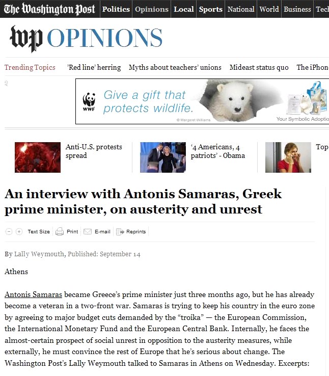Διαβάστε απόσπασμα της χθεσινής συνέντευξης του πρωθυπουργού κ Αντώνη Σαμαρά στην Washington Post.