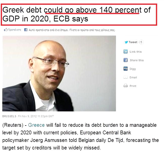 «Υπό την αμετάβλητη πολιτική, το χρέος το 2020 θα είναι υψηλότερο από 140 % του ΑΕΠ σύμφωνα με τις εκτιμήσεις της ΕΚΤ» ανέφερε ο Asmussen, ένα μέλος της εκτελεστικής επιτροπής ΕΚΤ, σε μια συνέντευξη του που δημοσιεύεται το Σάββατο.