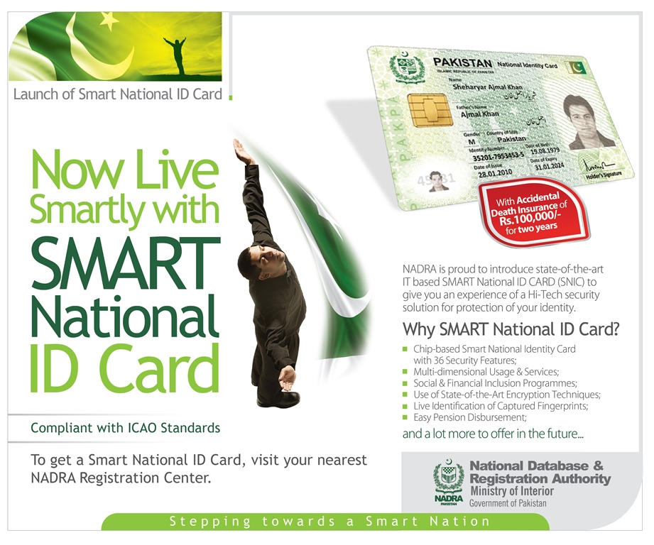 Η Nadra (National Database & Registration Authority) του Πακιστάν, σχεδίασε μια Ηλεκτρονική Ταυτότητα, τελευταία λέξη της τεχνολογίας, για την παροχή hi-tech λύσεων και την προστασία της ταυτότητας του κατόχου της. Η έξυπνη Εθνική Ταυτότητα (SNIC) είναι πολύ πιο έξυπνη και πιο εξελιγμένη σε σχέση με την προηγούμενη Μηχανογραφημένη Εθνική Ταυτότητα (CNIC). Αυτές έχουν ενσωματωμένο ένα τσιπάκι. Έχουν σχεδιαστεί με τέτοιο τρόπο ώστε να ανταποκρίνονται σε όλες τις ανάγκες που προκύπτουν από την εξέλιξη της τεχνολογίας αλλά και για να αποθηκεύονται επάνω τους δεδομένα. Οι έξυπνες κάρτες θα συνδέονται άμεσα με την κεντρική βάση δεδομένων της Nadra.