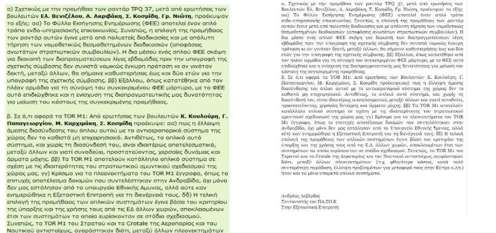β. Σε ό,τι αφορά τα TOR M1: Από ερωτήσεις των Βουλευτών Κ. Κουλούρη, Γ. Παπαγεωργίου, Μ. Καρχιμάκη, Σ. Κοσμίδη προέκυψε,αα) πως η έλλειψη άμεσης διασύνδεσης του όπλου αυτού με το αντιαεροπορικό σύστημα της χώρας δεν το καθιστά μη επιχειρησιακό. Αντιθέτως, το οπλικό αυτό σύστημα, και χωρίς τη διασύνδεσή του, είναι ιδιαιτέρως αποτελεσματικό, μεταξύ άλλων και γιατί συνοδεύει, προστατεύοντας, χερσαίες δυνάμεις και άρματα μάχης. ββ) Τα TOR M1 αποτελούν κατάλληλο οπλικό σύστημα σε σχέση με τις ιδιαιτερότητες του στρατιωτικού αμυντικού σχεδιασμού της χώρας μας. γγ) Κρίσιμα για τα πλεονεκτήματα του TOR M1 έγγραφα, όπως το επιτυχές αποτέλεσμα δοκιμών που συντελέστηκαν στην Ανδραβίδα, όχι μόνο δεν μας εστάλησαν από το Υπουργείο Εθνικής Άμυνας, αλλά ούτε καν ενημερώθηκε η Εξεταστική Επιτροπή για τη διενέργειά τους. δδ) Η τελική επιλογή της προμήθειας των οπλικών συστημάτων έγινε βάσει του κριτηρίου της ύπαρξης και της χρήσης τους από τις Ε.Δ. άλλων χωρών, αποκλειομένων έτσι των συστημάτων τα οποία ευρίσκονταν σε στάδιο σχεδιασμού. Συνεπώς, τα TOR M1 του Στρατού και τα Crotale της Αεροπορίας και του Ναυτικού αντιστοίχως, αγοράστηκαν διότι, μεταξύ άλλων πλεονεκτημάτων (π.χ. φθηνότερο κόστος, κατά πολύ συντομότερη παράδοση, έλλειψη προβλημάτων για μεταφορά τους στην Κύπρο κ.λπ.) ήταν και τα μόνα υπαρκτά οπλικά συστήματα.”
