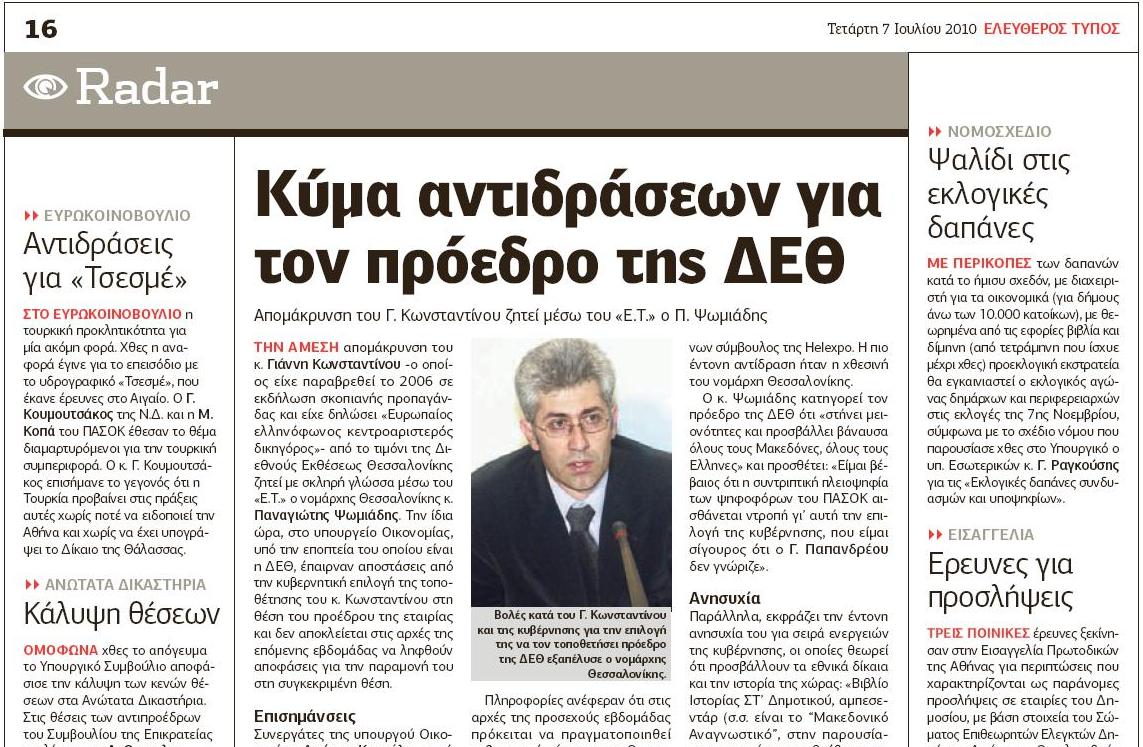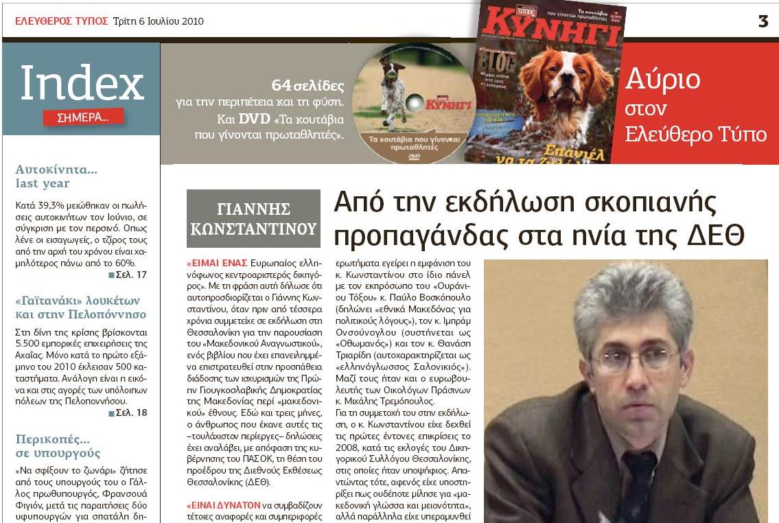 Ο νέος πρόεδρος της ΔΕΘ κ. Γιάννης Κωνσταντίνου αυτοπροσδιορίζεται ως “ελληνόγλωσσος” σε εκδήλωση για την παρουσίαση του “Μακεδονικού Αναγνωστικού”. Το blog μας το αποκαλύπτει και η είδηση κάνει τον γύρο των έντυπων ΜΜΕ και πολλών sites και ιστολογίων. Οι τηλεοράσεις δεν το έχουν πάρει μυρωδιά ακόμη. Πάντως, έπειτα από 3 απανωτά δημοσιεύματα του Ελεύθερου Τύπου (5,6,7 Ιουλίου), το Πρώτο Θέμα παίρνει την σκυτάλη στην αυριανή του έκδοση. Ως Αδιάβροχοι ευχαριστούμε πολύ τους συναδέλφους που δεν αφήνουν τόσο σημαντικά πράγματα να “πέσουν κάτω”.